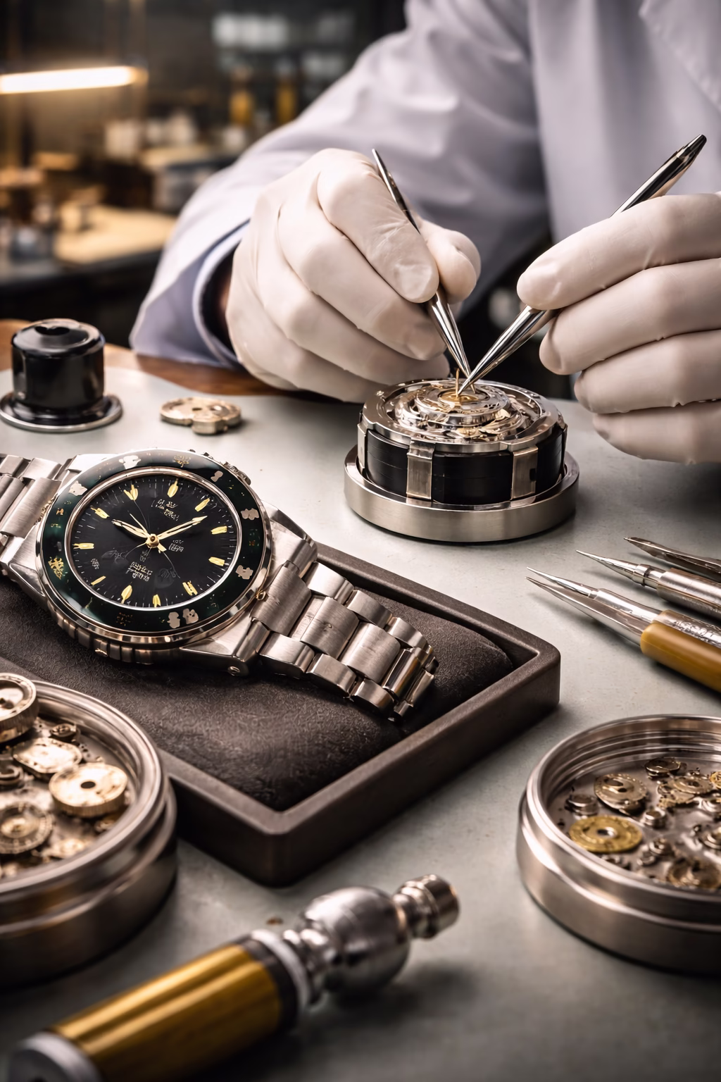 Disassembly and cleansing— full taking apart of instance, movement, bracelet; deep cleaning (ultrasonic/steam) to eliminate old lubrication, dirt, and impurities.